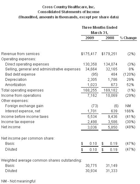 Cross Country Healthcare Reports First Quarter 2009 Results