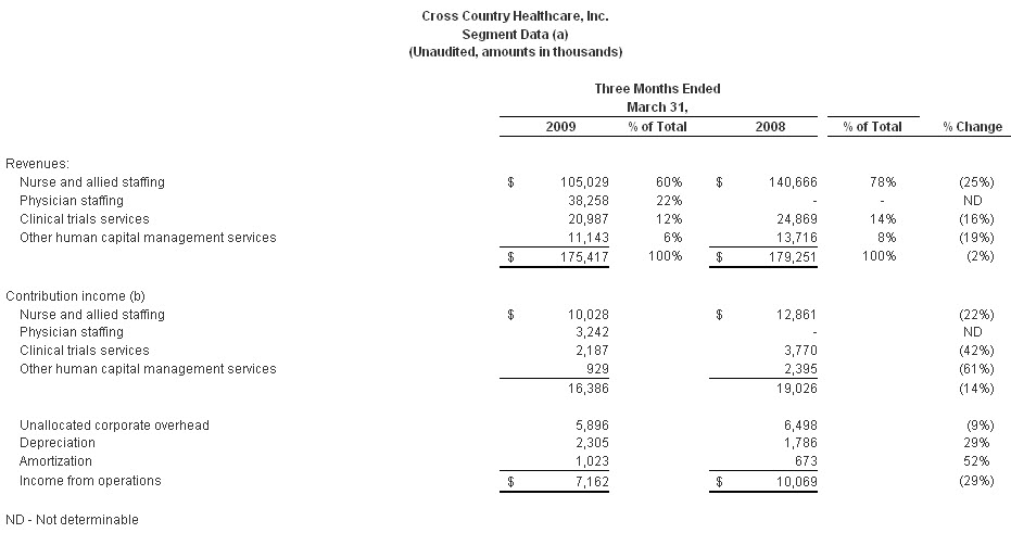 For the first quarter of 2009, the nurse and allied staffing business segment (travel and per diem nurse and travel allied staffing) generated revenue of $105.0 million, reflecting a 25% decrease from the prior year quarter and a 15% decrease sequentially from the fourth quarter of 2008. Contribution income (defined as income from operations before depreciation and amortization, impairment charges and corporate expenses not specifically identified to a reporting segment) decreased 22% in the first quarter of 2009 to $10.0 million from $12.9 million in the same quarter a year ago, and decreased 21% sequentially from the fourth quarter of 2008, reflecting a sharp decline in demand for temporary nurse and allied staffing services due to the current economic environment and its impact on the national labor market, as well as continued weak hospital admission trends.